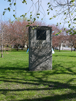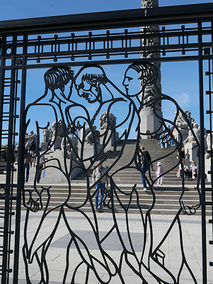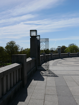 公園の中心部に階段状に石が積み上げられた「モノリスの台地」と呼ばれる場所があり、その途中にはヴィーゲランがデザインした鉄製の門がある。