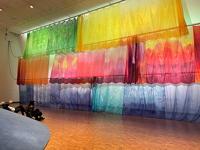 ブラジルの作曲家の音楽が流れる空間に、観客が自由に行き来できる円形の丘のようなものが設置されていて、その前にはカラフルな布が吊るされていてゆるやかに動いていました |