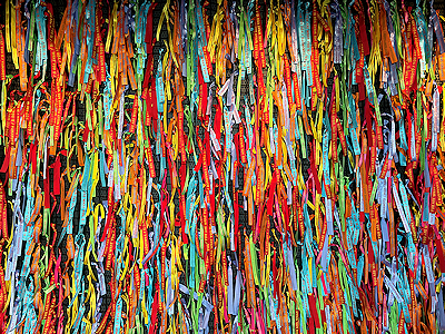 | こちらもカラフルな作品 展覧会の題名などが印刷されたリボン