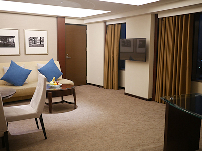 シャングリ・ラ・ホテルのエグゼクティブラウンジであるホライゾンクラブラウンジが利用できるホライゾンクラブデラックスルーム/ツインを予約していたのですが、アップグレードしていただけてスイートルームに宿泊しました。